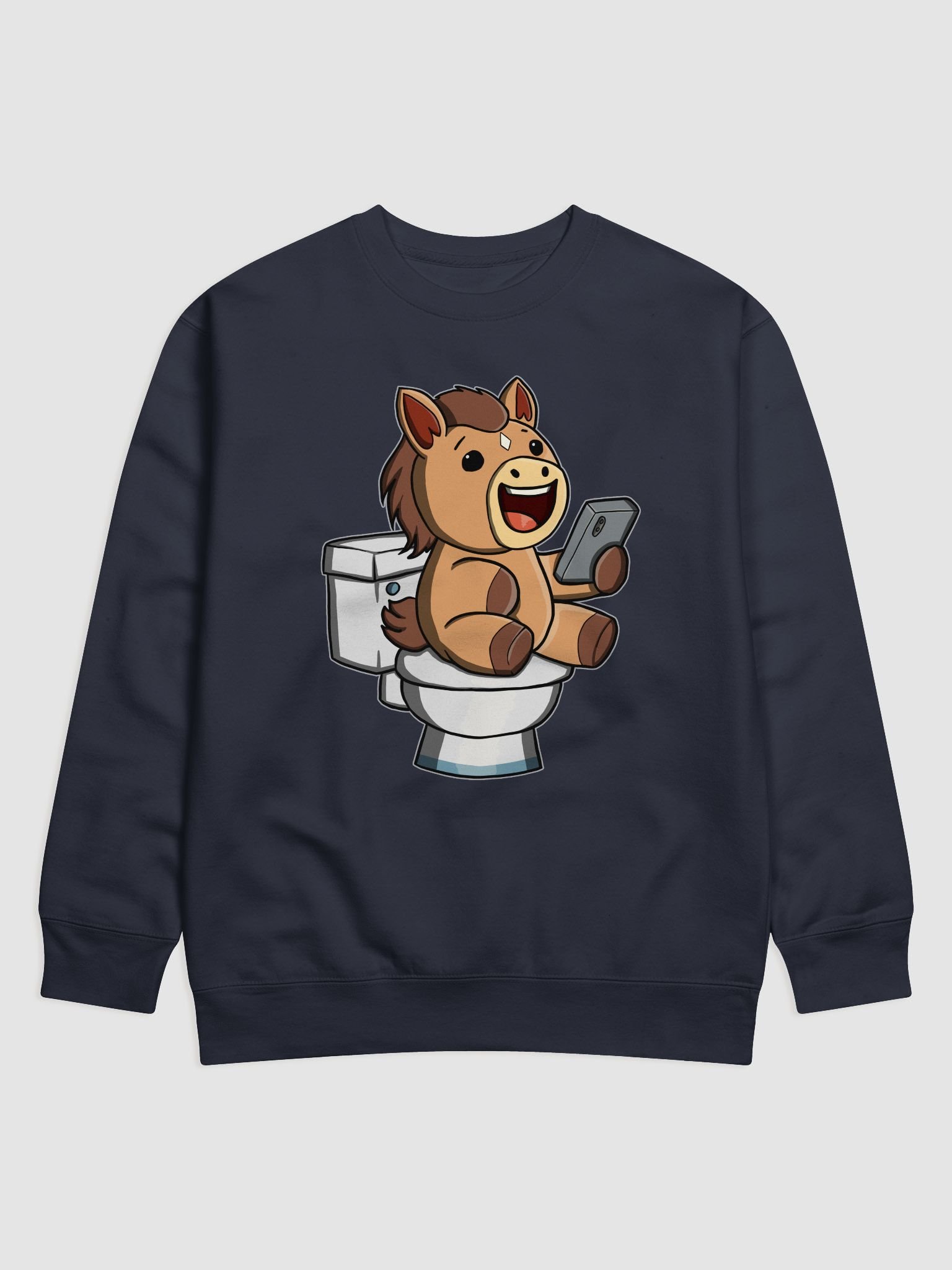 Embrace the chaos of modern life with the ultimate bathroom buddy! This hilarious sweatshirt features a joyful plush horse, perched regally on the porcelain throne, glued to their phone like the rest of us.